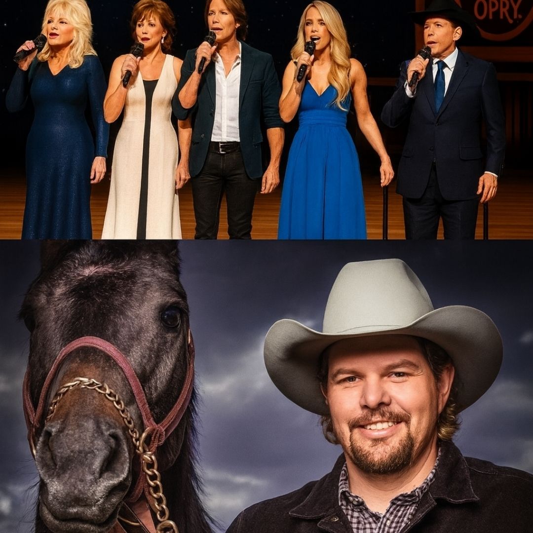 On that unforgettable night, the Grand Ole Opry was no longer just Nashville’s stage — it became something sacred, a place where music turned into prayer. The circular stage glowed under dim lights as country legends appeared one after another, not to entertain, but to open their hearts. Every note was a tribute, every lyric a farewell. Together, they carried Toby Keith on wings of song, sending him home with the love of his peers and the tears of thousands.