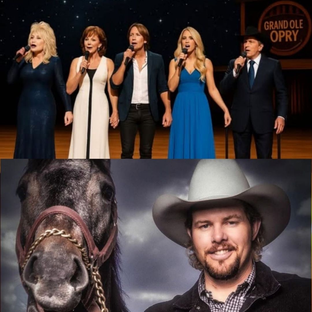 On that unforgettable night, the Grand Ole Opry was no longer just Nashville’s stage — it became something sacred, a place where music turned into prayer. The circular stage glowed under dim lights as country legends appeared one after another, not to entertain, but to open their hearts. Every note was a tribute, every lyric a farewell. Together, they carried Toby Keith on wings of song, sending him home with the love of his peers and the tears of thousands.